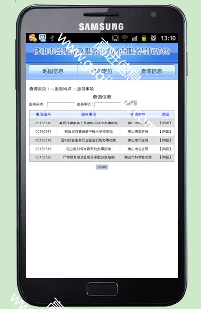 2011 年,按佛山市行政服務(wù)中心體系建設(shè)工作要求,全市共設(shè)立各級行政服務(wù)中心767 個,行政服務(wù)網(wǎng)點的城鄉(xiāng)覆蓋率已達到100%。目前,各級行政服務(wù)中心網(wǎng)點體系雖然已經(jīng)建立起來,但群眾到各服務(wù)大廳辦事尚缺乏統(tǒng)一和便捷的指引。為此,佛山市人民政府行政服務(wù)中心擬建設(shè)全市各級行政服務(wù)中心網(wǎng)點服務(wù)導(dǎo)向系統(tǒng),以GIS 地理信息系統(tǒng)為基礎(chǔ),將各網(wǎng)點的所處位置、交通方式、服務(wù)事項、辦事指南、聯(lián)系方式等各類信息進行數(shù)字化配置后在互聯(lián)網(wǎng)發(fā)布,方便市民按需獲取以覆蓋城鄉(xiāng)的行政服務(wù)中心網(wǎng)點為主的就近服務(wù)渠道,依托佛山市行政服務(wù)中心已經(jīng)建成“內(nèi)聯(lián)五區(qū)、外延村居”的100 余個服務(wù)網(wǎng)點,這些網(wǎng)點將作為“線”與“網(wǎng)”的實體結(jié)合處為就近尋求服務(wù)的市民,提供自助終端與實體窗口相結(jié)合的服務(wù)。市民與企業(yè)可以通過服務(wù)網(wǎng)點地理導(dǎo)向系統(tǒng)切實享受到標(biāo)準(zhǔn)化的落地服務(wù),達到“同城生活、同城便捷”的目的。