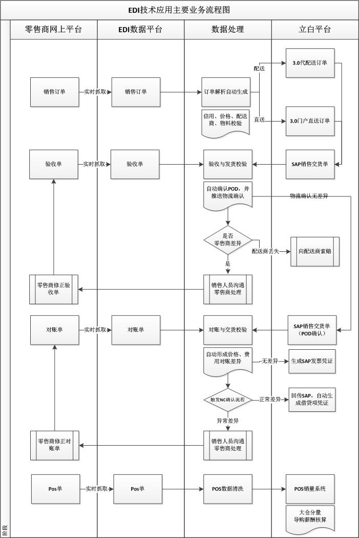 現(xiàn)代渠道訂單處理目前是由訂單文員通過人工登錄門店網(wǎng)站下載訂單,再轉(zhuǎn)換為直營訂單或經(jīng)銷商代配送訂單,訂單下載效率低并且占用大量的人力資源;利用EDI訂單自動下載功能,實現(xiàn)24小時無人值守訂單自動下載,確保訂單數(shù)據(jù)的實時同步,提升現(xiàn)代渠道整體配送效率;價格異常訂單自動校驗,維護(hù)集團價格形象,完全規(guī)避未獲得公司審批的低價訂單被送貨的風(fēng)險。