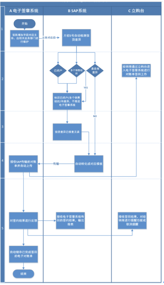 SAP自行檢測對賬單,并將檢測無誤后的對賬單自動上傳到電子簽章系統(tǒng)。經(jīng)銷商用任意母子賬號登入立購臺時,系統(tǒng)提示經(jīng)銷商有需要簽回的對賬單,并跳轉(zhuǎn)到電子簽章系統(tǒng)進(jìn)行簽回工作。