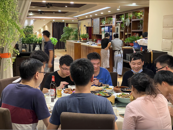 在晚上聚餐期間,同事們大家嘮家常,講經(jīng)驗,談?wù)撝芏嗍拢绞拢拢哒勯熣摚@種感覺很好,沒有級別的障礙,暢所欲言。