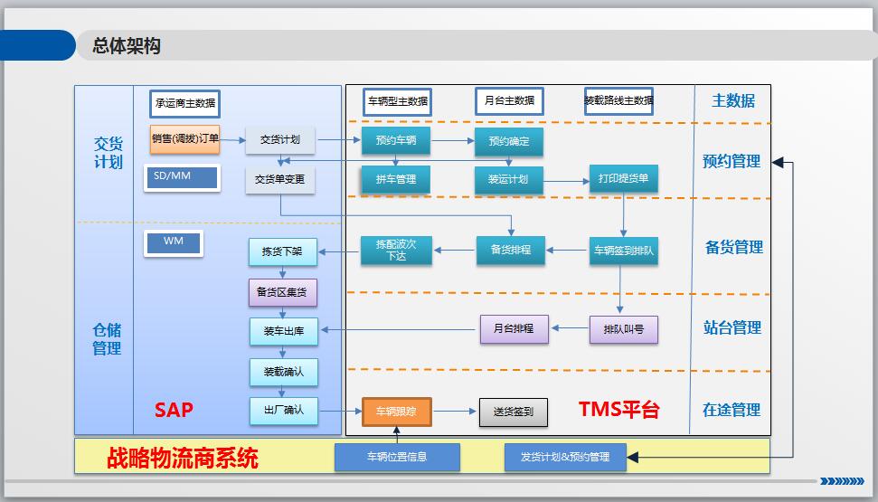 依據(jù)物流構(gòu)想,借助功能完善及軟件集合建立TMS運(yùn)輸管理系統(tǒng),使用訂單執(zhí)行監(jiān)控形成完整的信息流。通過(guò)多種方法和其他相關(guān)的操作一起提高物流的管理能力;包括管理裝運(yùn)單位,指定企業(yè)內(nèi)、外的發(fā)貨計(jì)劃,管理運(yùn)輸模型、基準(zhǔn)和費(fèi)用,維護(hù)運(yùn)輸數(shù)據(jù),生成提單,優(yōu)化運(yùn)輸計(jì)劃,選擇承運(yùn)人及服務(wù)方式,招標(biāo)和投標(biāo),審計(jì)和支付貨運(yùn)賬單,處理貨損索賠,安排勞力和場(chǎng)所,管理文件和管理第三方物流。